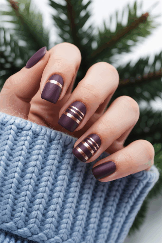 Dark plum matte nails offer a rich, elegant base that fits well with winter styles. The matte finish gives a modern, understated look.