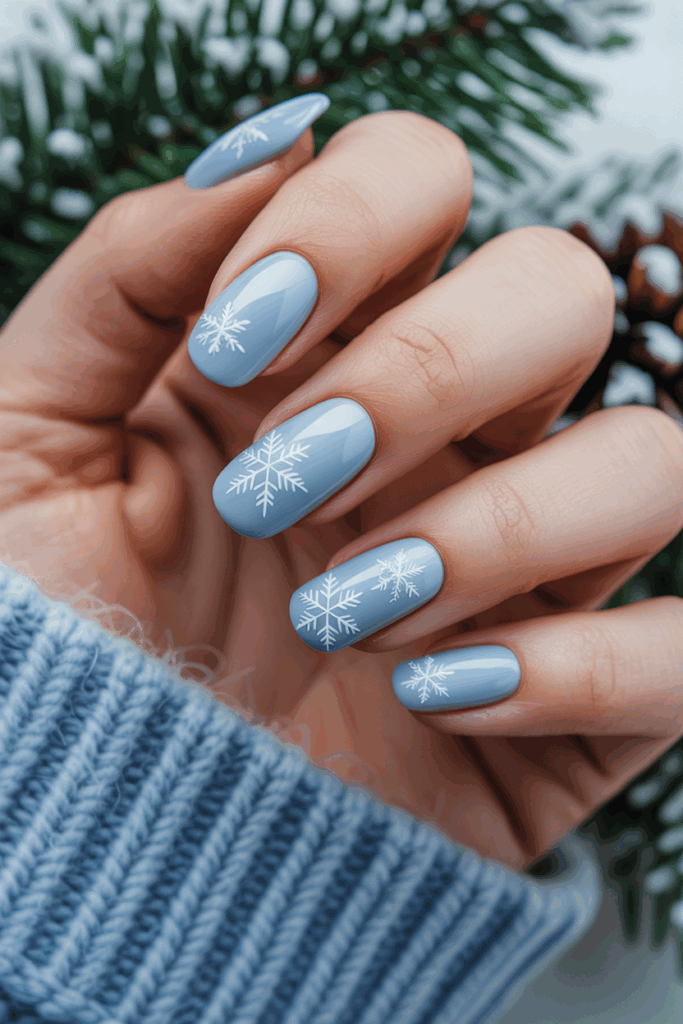 Frosty blue nails create a cool, wintery look. Snowflake accents add a delicate, seasonal touch.