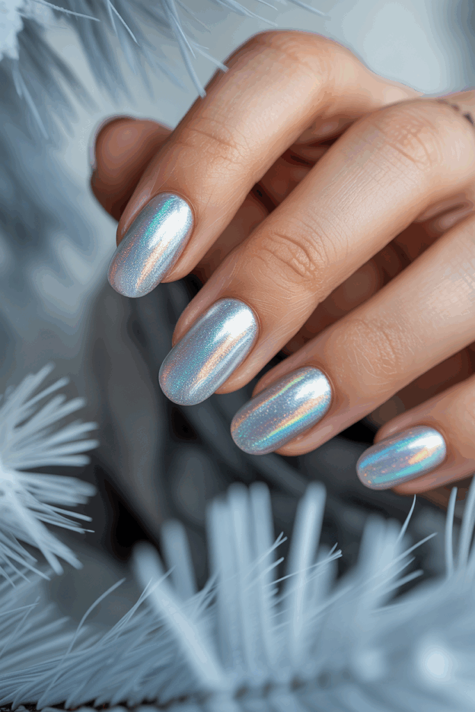 Icy silver chrome nails offer a sleek, modern style perfect for winter. Their cool shine reflects light, giving a clean and polished appearance.