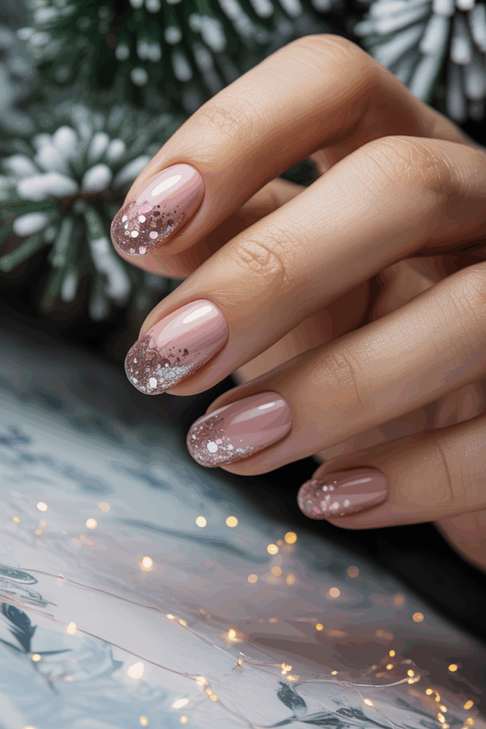 This style features a soft powder pink base that fades into glitter at the tips. The gradient effect adds shine without overwhelming the look. It suits both casual and formal winter occasions. The subtle shimmer brings a stylish touch to any manicure.