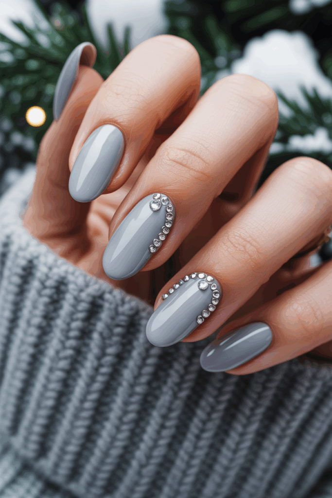 This design features a smooth, icy grey base that is both modern and subtle. Diamond studs add a touch of sparkle without being overpowering. It is perfect for those who want a polished look with a little extra shine during winter.