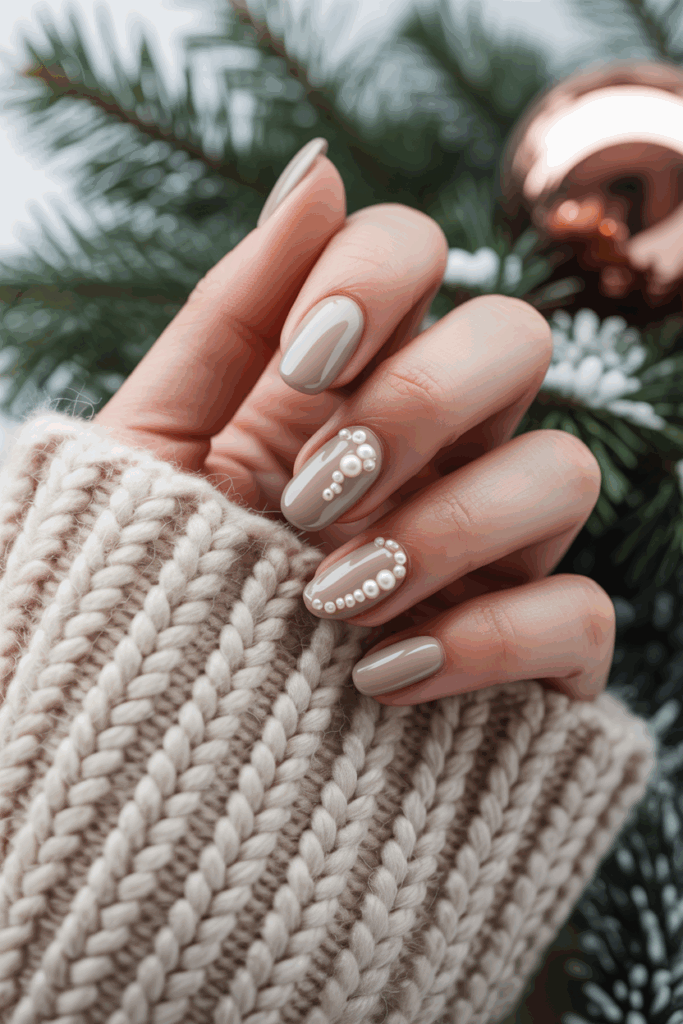 They create a soft, elegant look perfect for winter. The beige base keeps nails simple and chic.
