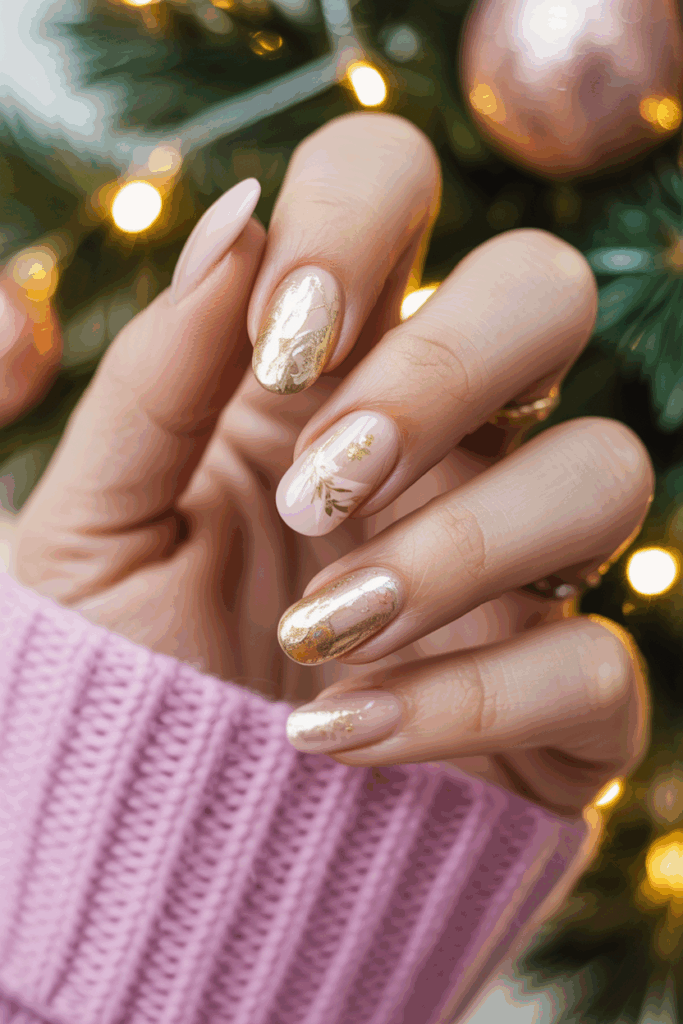 Soft blush pink makes such a gentle and feminine base for winter, and adding a light gold dusting gives it just enough holiday sparkle. The shimmer is extremely fine, so it doesn’t look glittery or bold, but instead gives your nails this warm, candlelit glow that feels cozy and elegant at the same time.