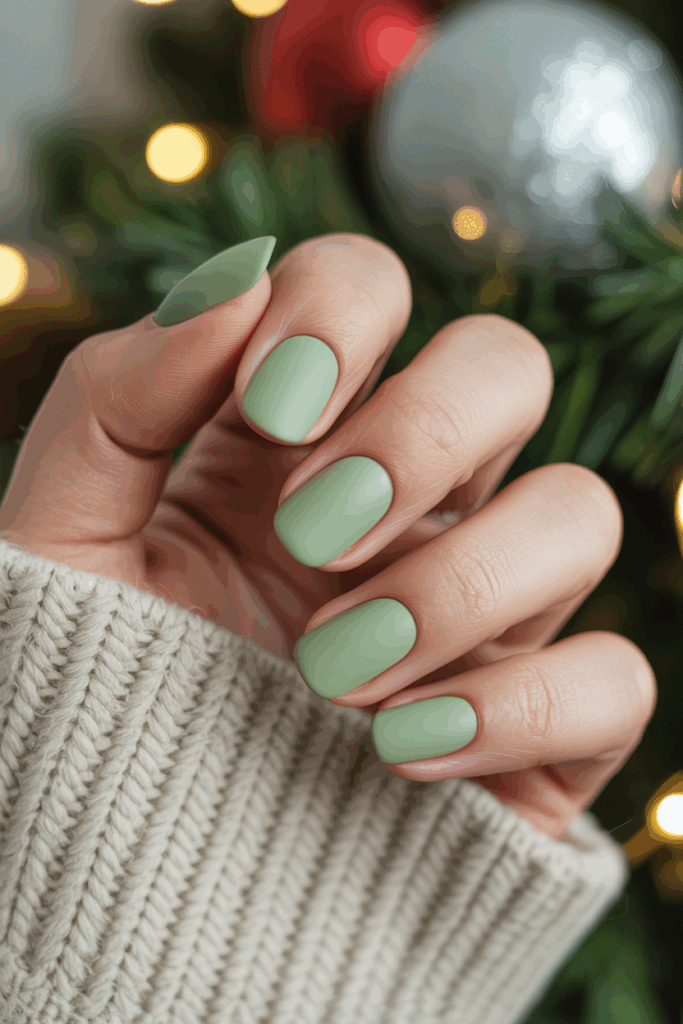 This look is wonderful for anyone who wants something a little different from typical red or sparkly looks. The matte texture keeps everything minimal, while the muted green feels naturally holiday-inspired without being obvious.