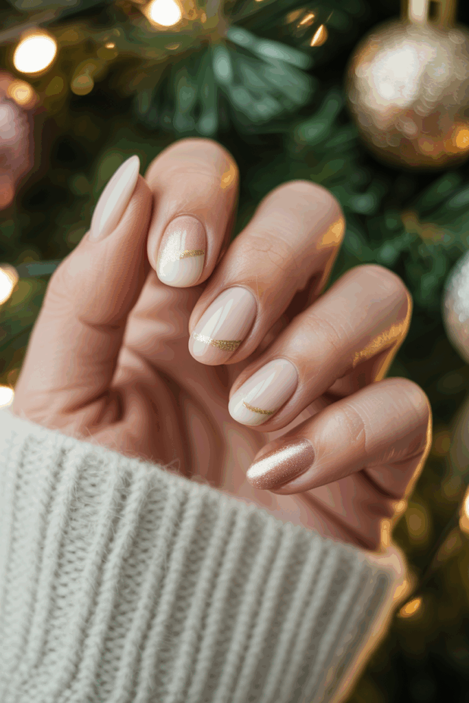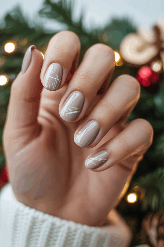 This nail design uses soft, neutral colors like beige, taupe, or light pink. It creates a clean and elegant look that fits the holiday season without being loud.