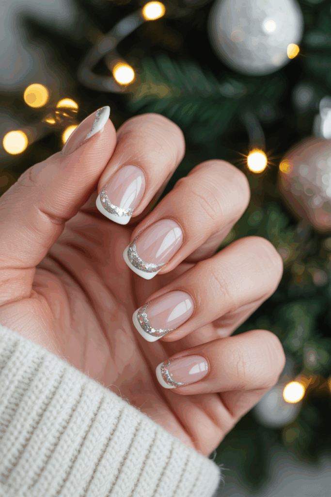 This design keeps the classic French manicure but adds a silver glitter smile line. The glitter is subtle, giving just a hint of sparkle without being overwhelming.