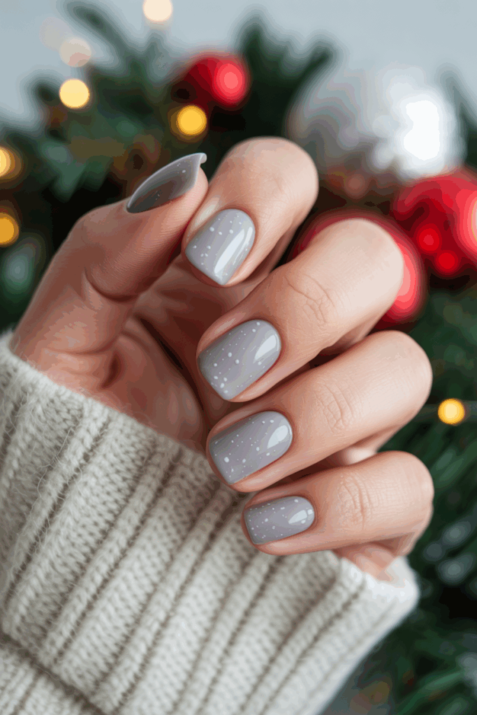 This design uses a cloudy, soft grey as the base, giving your nails a cozy winter-sky look. Adding small white speckles creates a snow-dust effect that looks subtle and gentle. It’s festive without looking like nail art, and the speckles melt naturally into the grey for a beautiful, wintry finish.