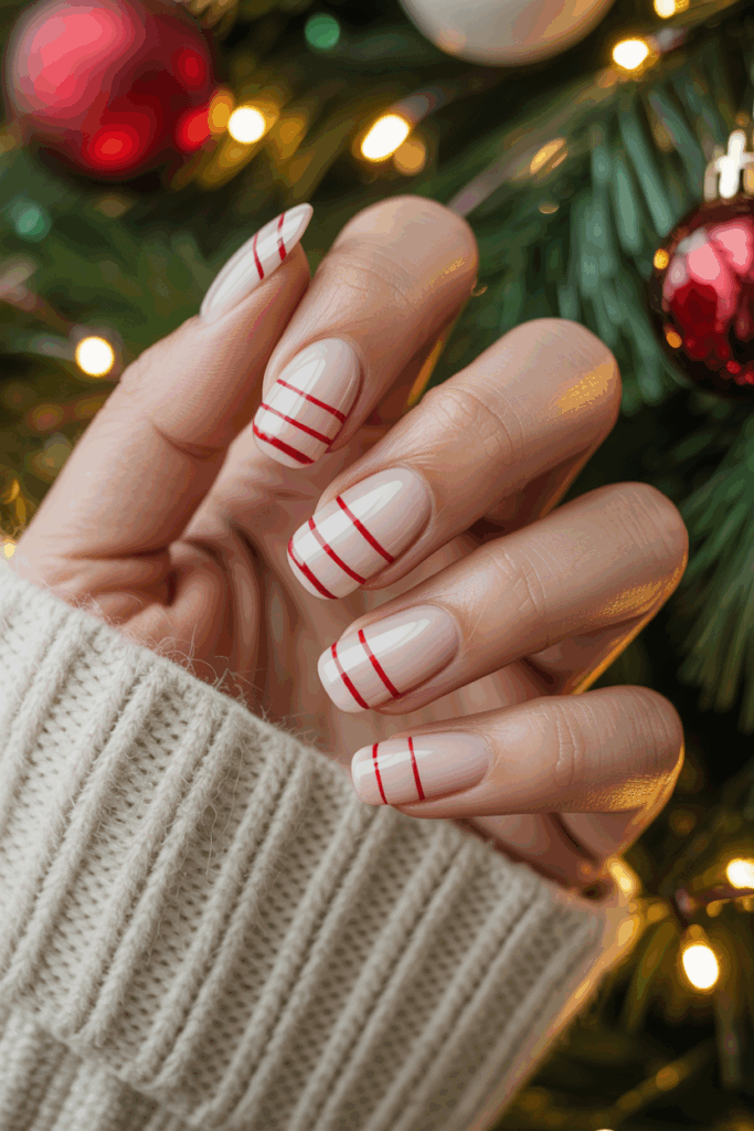 The red stripes are usually placed near the tips or along the nail edges. This keeps the look subtle while still showing holiday spirit.