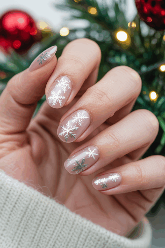 The white snowflakes are small and delicate, adding a subtle festive touch without being too bold. This style works well for those who want a simple winter look.