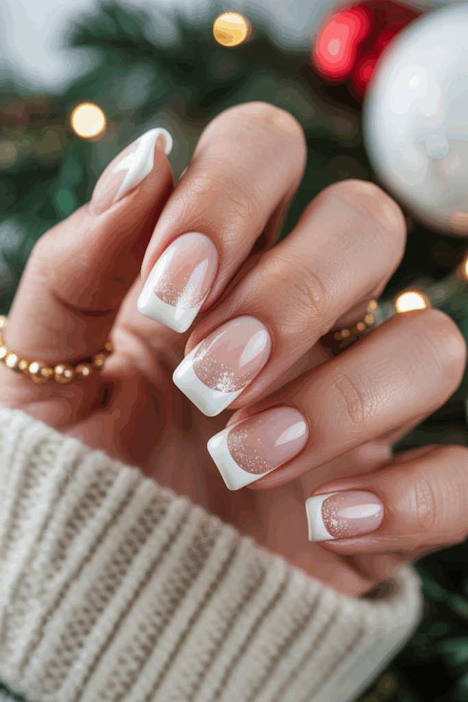 A frosted French manicure adds a soft, wintry touch to the classic French tip. The tips are coated with a subtle, icy shimmer that captures a light, snow-like effect.