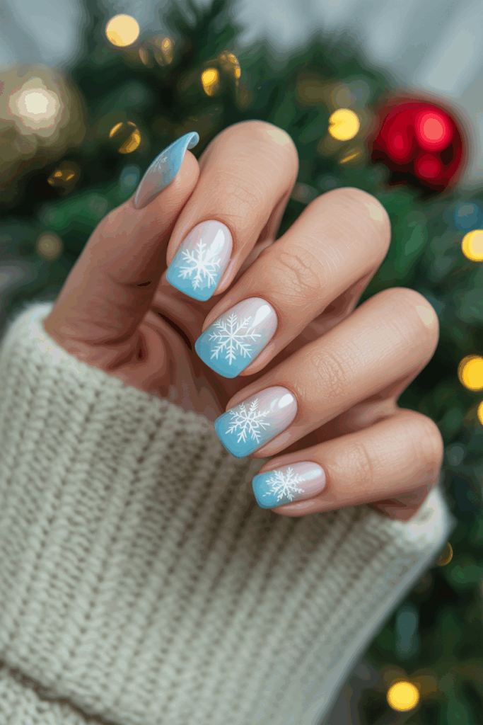 This nail design features a soft ombre effect that fades from light blue to a pale shade. It creates a calm and cool base for the white snowflake details.