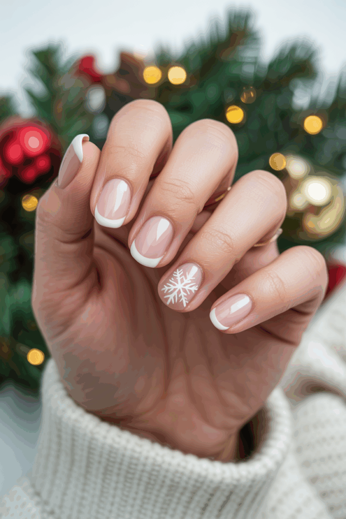 This design features a simple snowflake on just one nail, often called an accent nail. The rest stay painted in a solid, neutral color to keep the look clean and elegant.