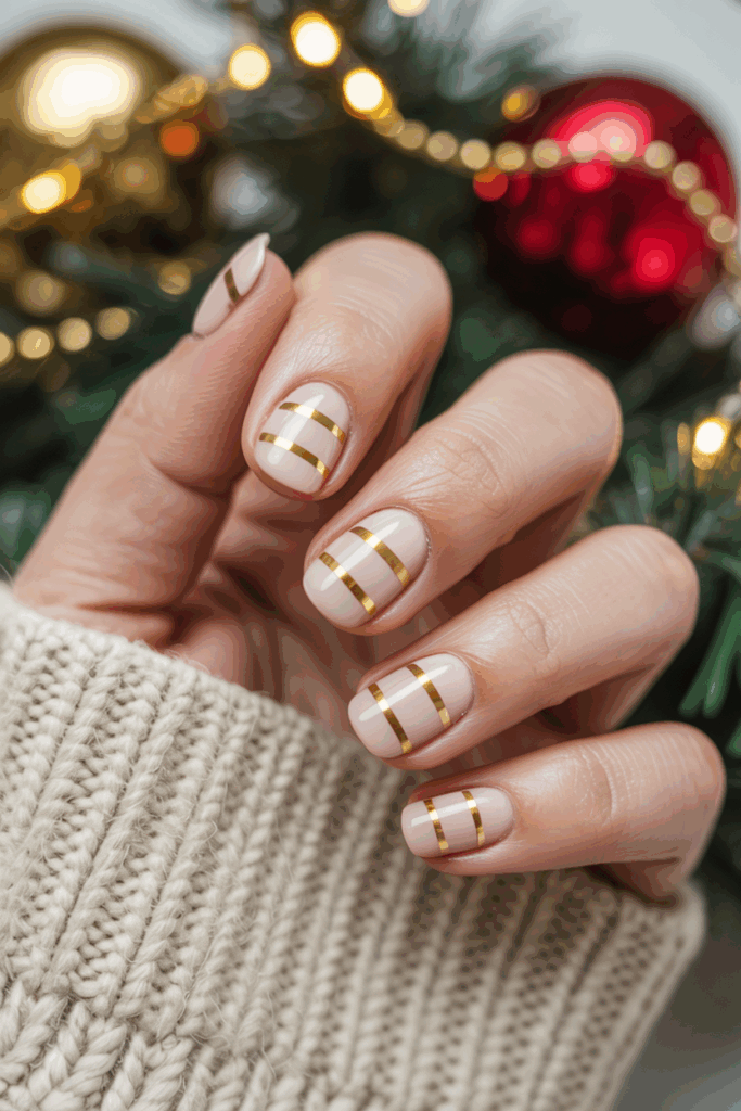 This style pairs well with nude or soft-colored bases, making it perfect for those who prefer a minimal look. The gold lines highlight the nails with a festive feel while keeping the overall design simple and classy.