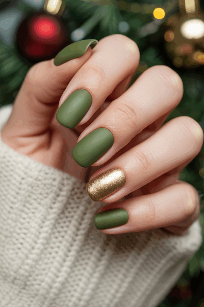 Gold accents add a touch of brightness and create a subtle contrast against the muted green. These accents are often applied as thin lines or small shapes to keep the design simple but festive.