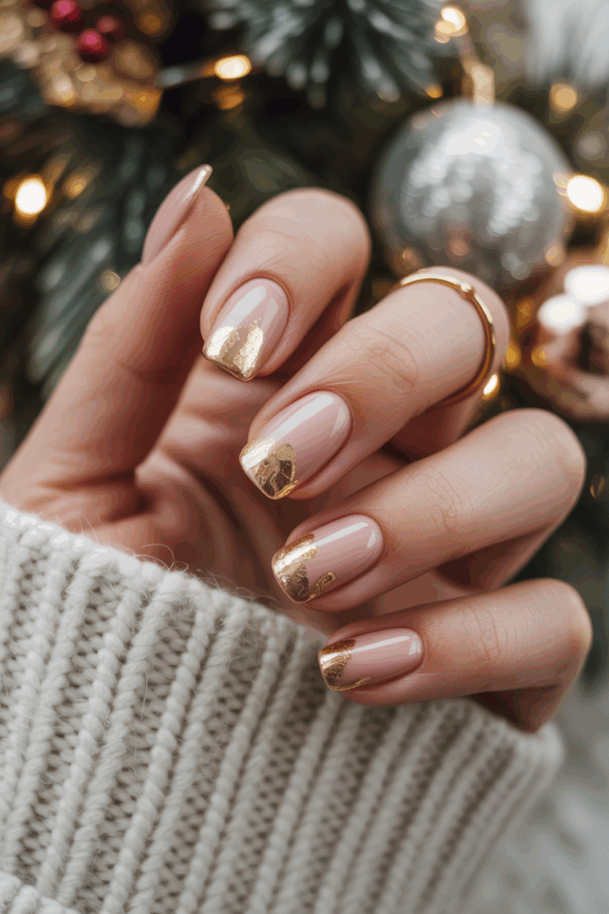 The combination of rosy nude and gold foil creates a balanced look suitable for the holiday season.