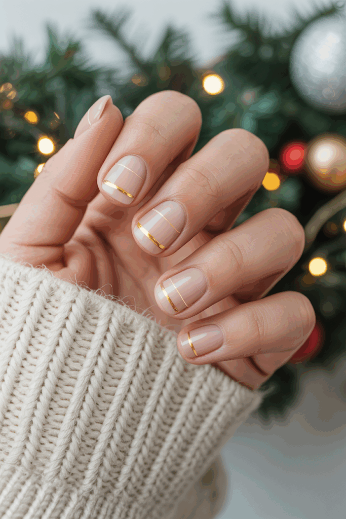 Short square nails offer a clean and modern shape that works well for subtle Christmas designs. Adding thin gold lines creates a delicate touch of elegance without being too flashy.