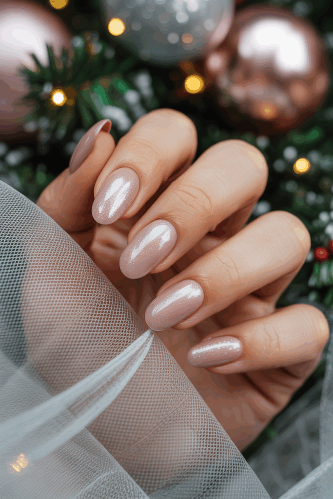 A dusty rose base gives your nails a soft, muted color that still feels a little festive. Layering a sheer silver veil on top adds a fine, subtle sparkle that’s noticeable without taking over the look. It creates a delicate blend of warmth and winter shimmer that feels feminine and elegant.