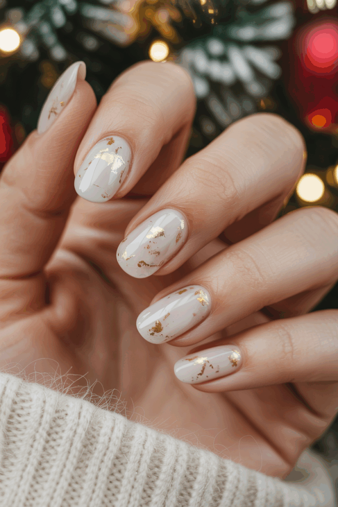 This nail design uses a soft white marble base that feels light and elegant. The look is simple but refined, perfect for subtle holiday style.