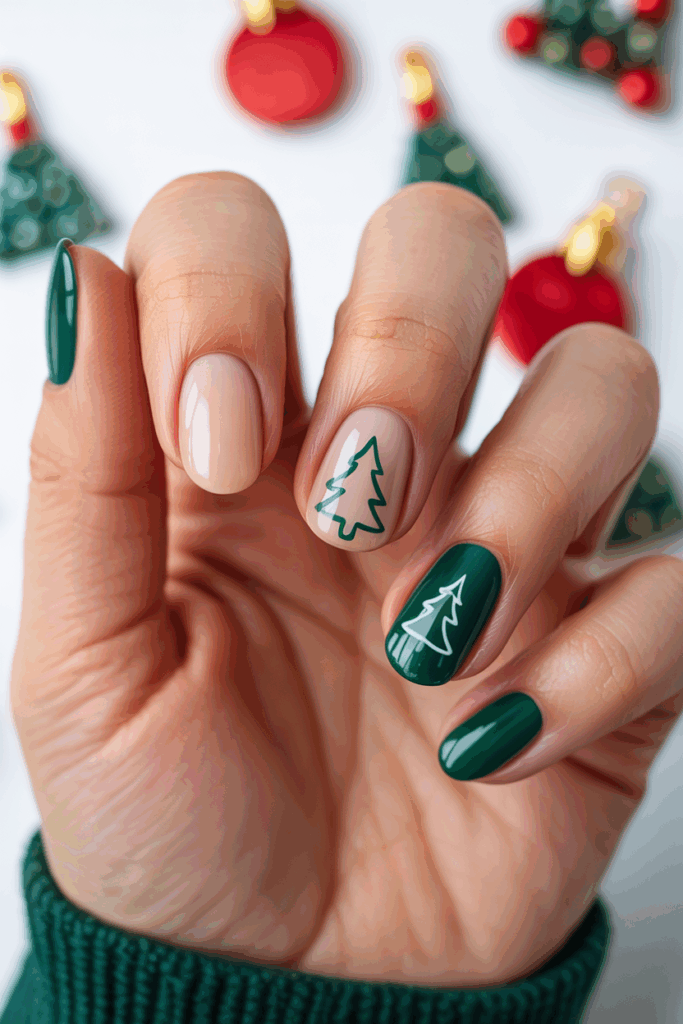 This design features a small, simple Christmas tree outline on just one nail. It keeps the look minimal while still adding a festive touch.