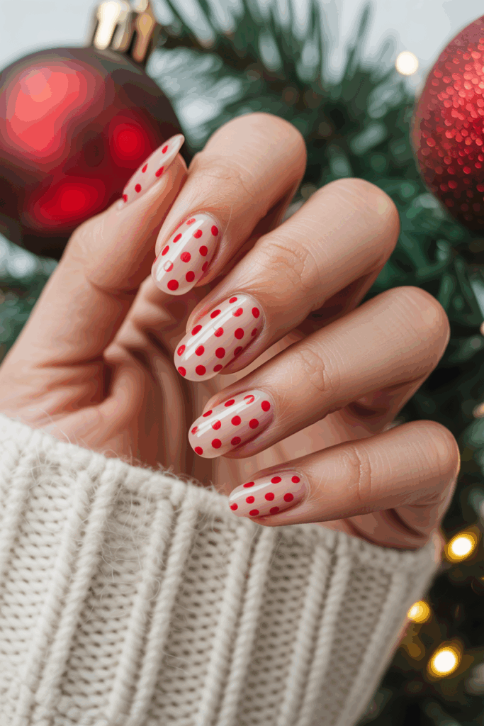 Small red polka dots are added evenly across the nails. The red adds a festive touch without being too bold or bright.