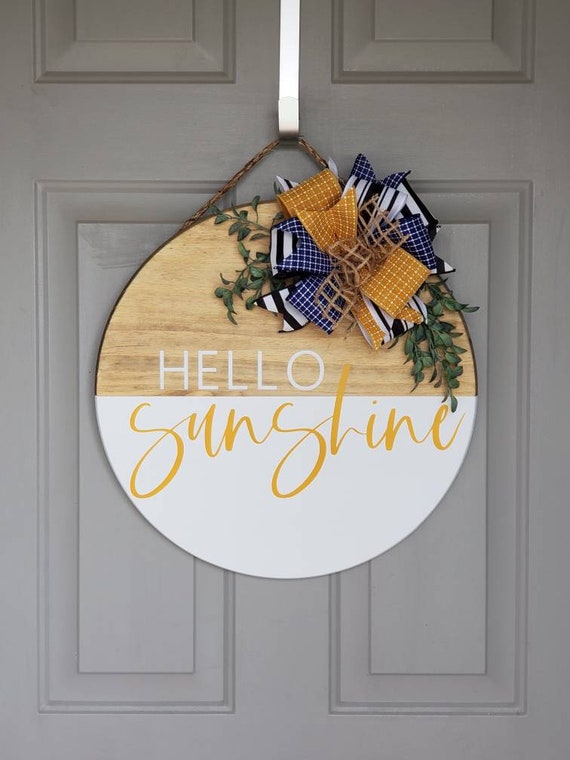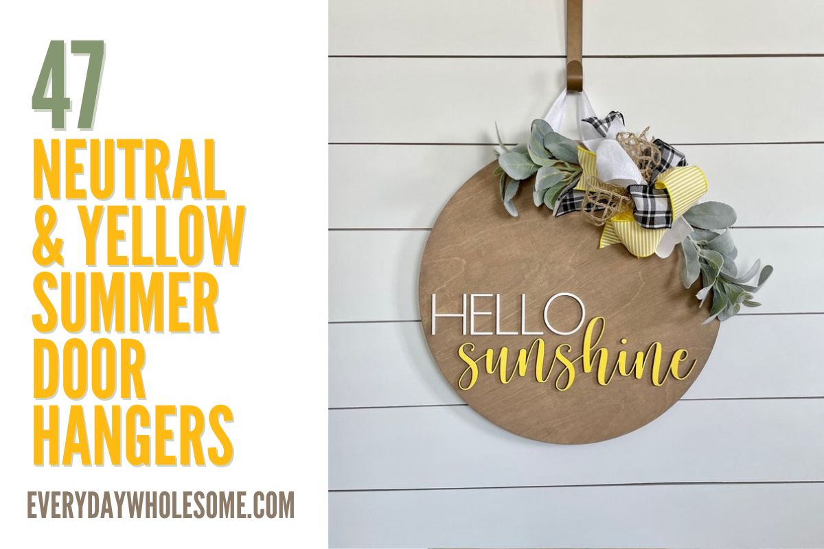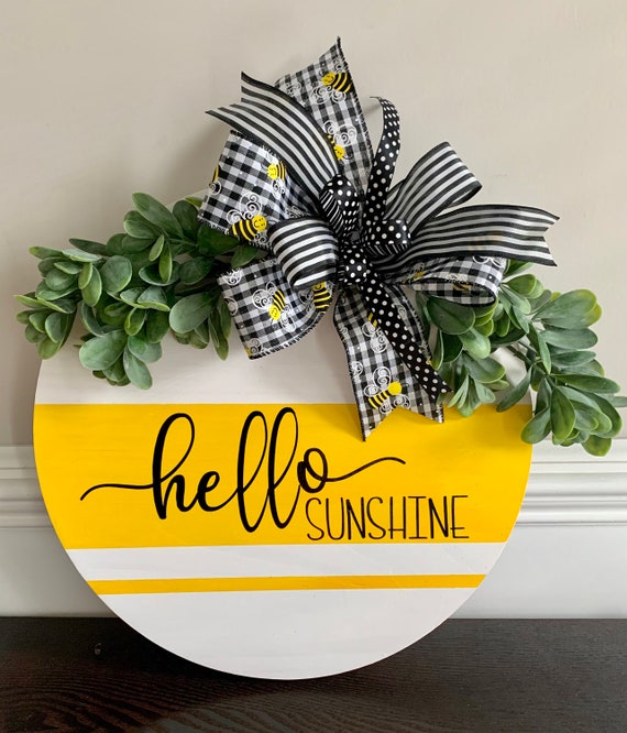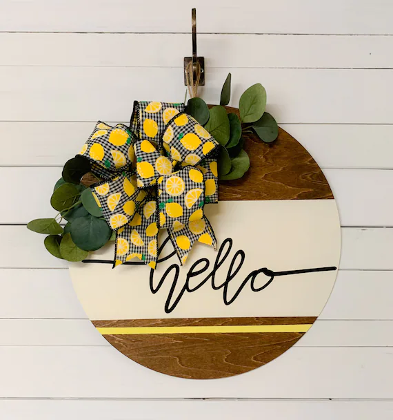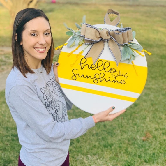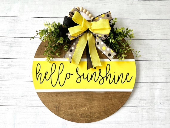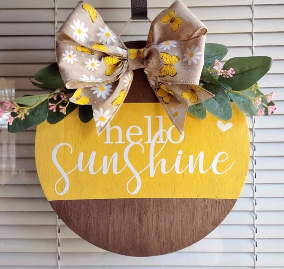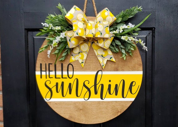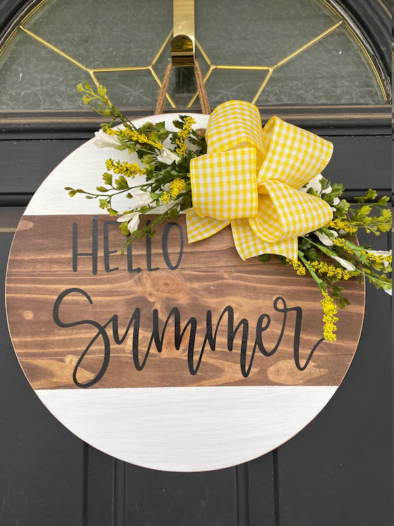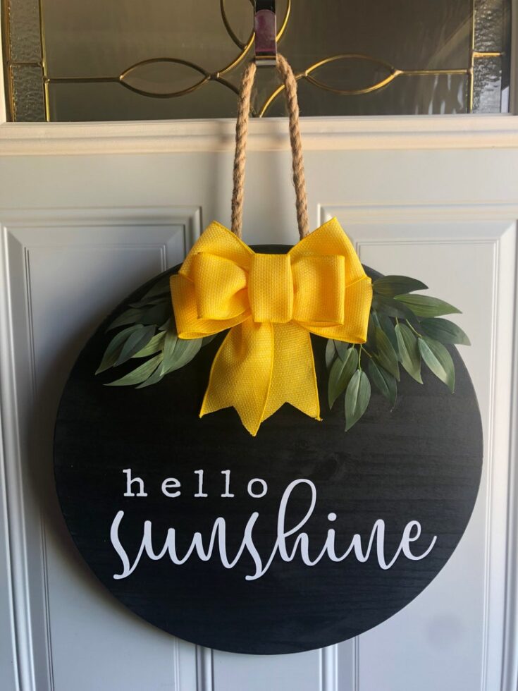 Use these bright yellow hello sunshine wooden door hangers with ribbons as your summer welcome decorations to say hello summer to your summer guests for 4th of July and all summer events!