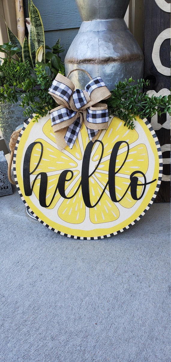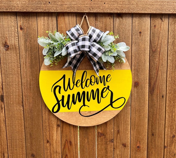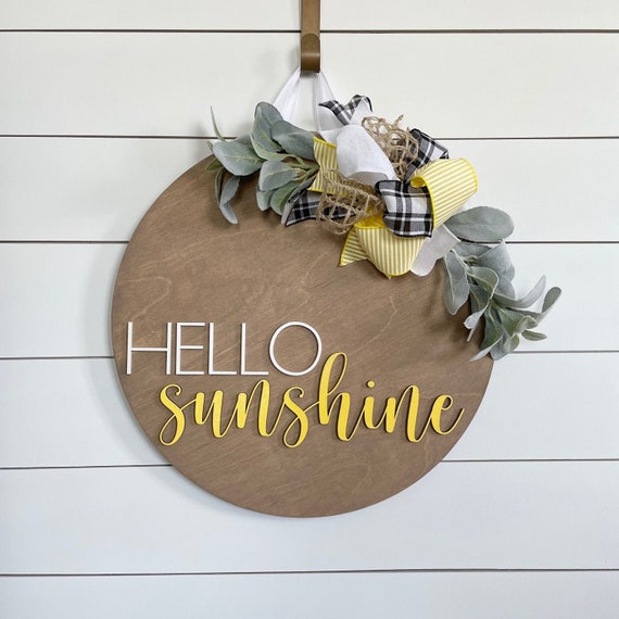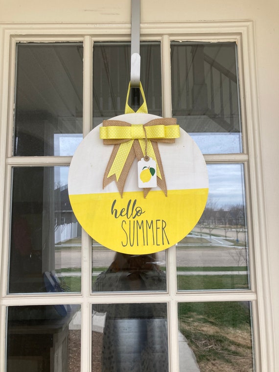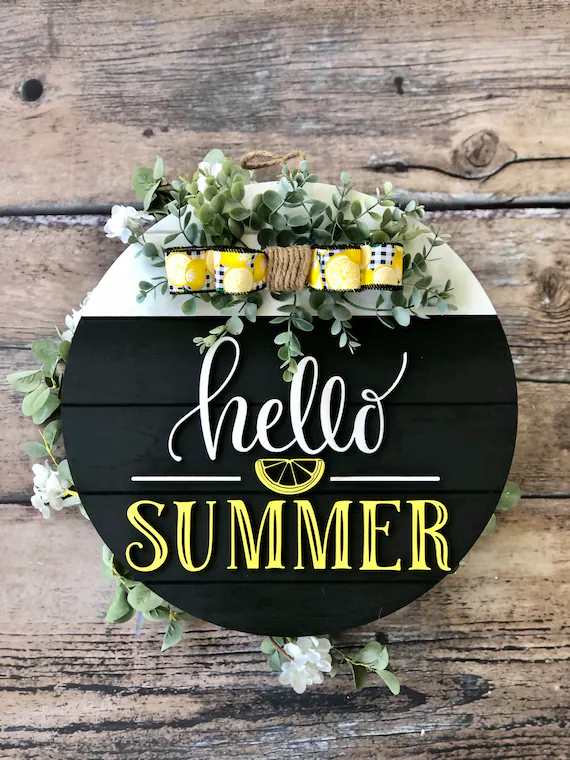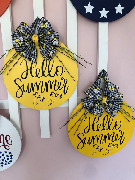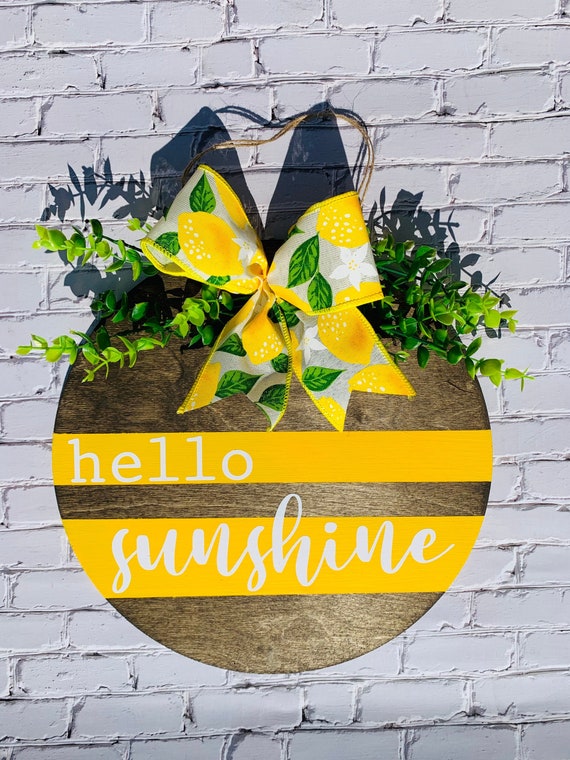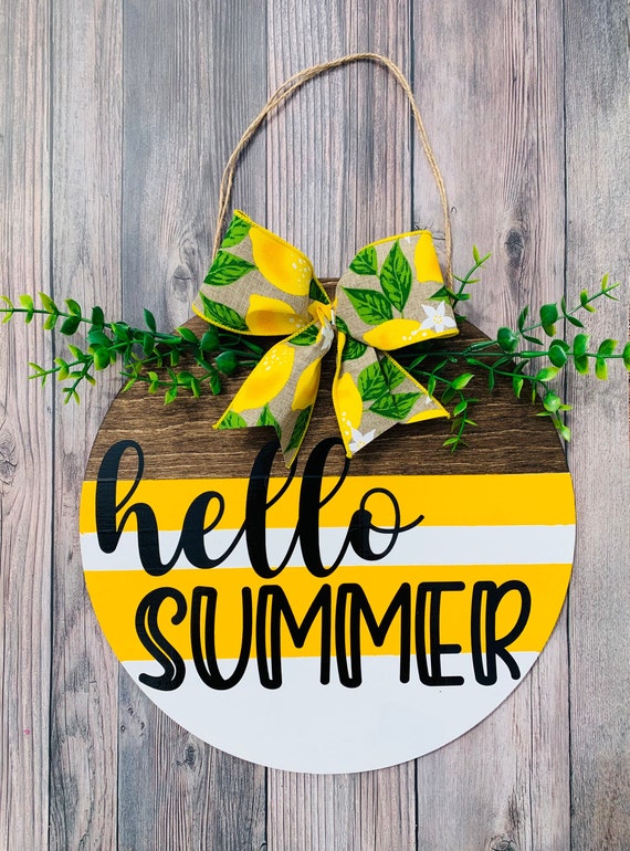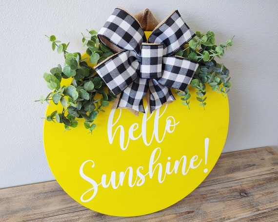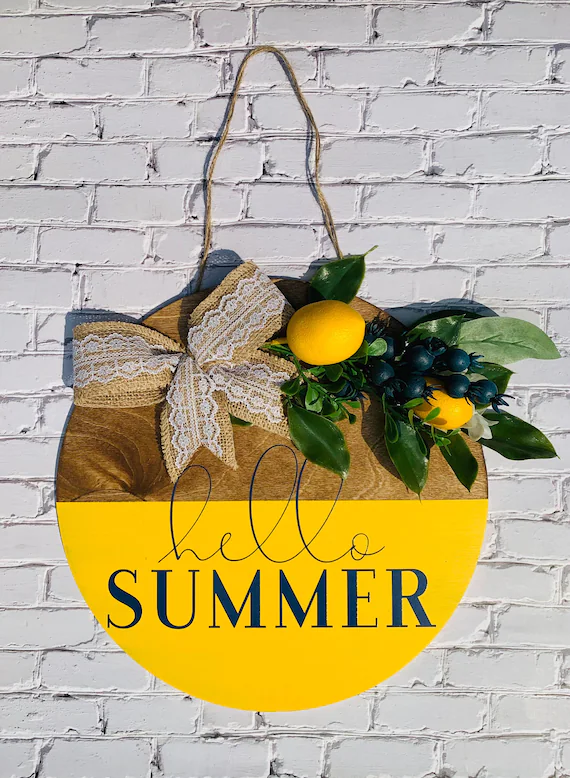 Use these bright yellow hello sunshine wooden door hangers with ribbons as your summer welcome decorations to say hello summer to your summer guests for 4th of July and all summer events!