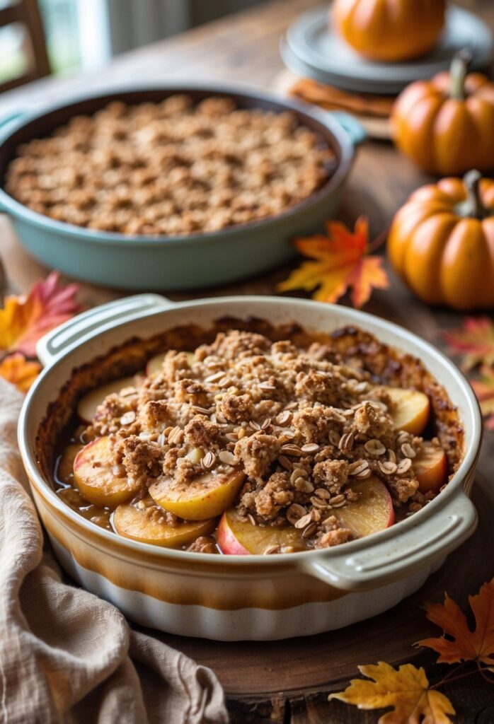 The recipe typically uses a blend of tart and sweet apples to balance flavor. The oats in the topping add texture and help absorb some of the fruit juices during baking. Butter and brown sugar enhance the sweetness and crispness of the topping.