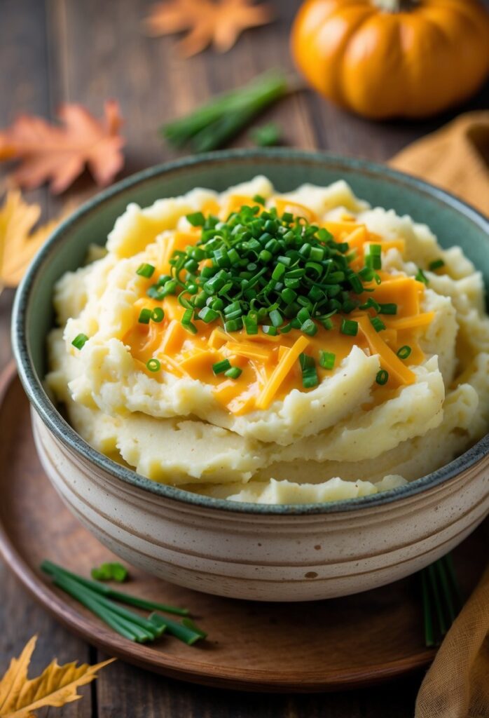 Chive and cheddar mashed potatoes are a creamy, flavorful side dish that fits well with Thanksgiving menus. The addition of sharp cheddar cheese gives the potatoes a rich, savory taste, while fresh chives add a mild onion-like brightness.