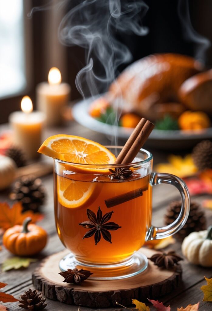 Spiced mulled cider is a classic warm beverage often enjoyed during Thanksgiving. It combines apple cider with spices like cinnamon sticks, cloves, star anise, and allspice to create a comforting and aromatic drink.