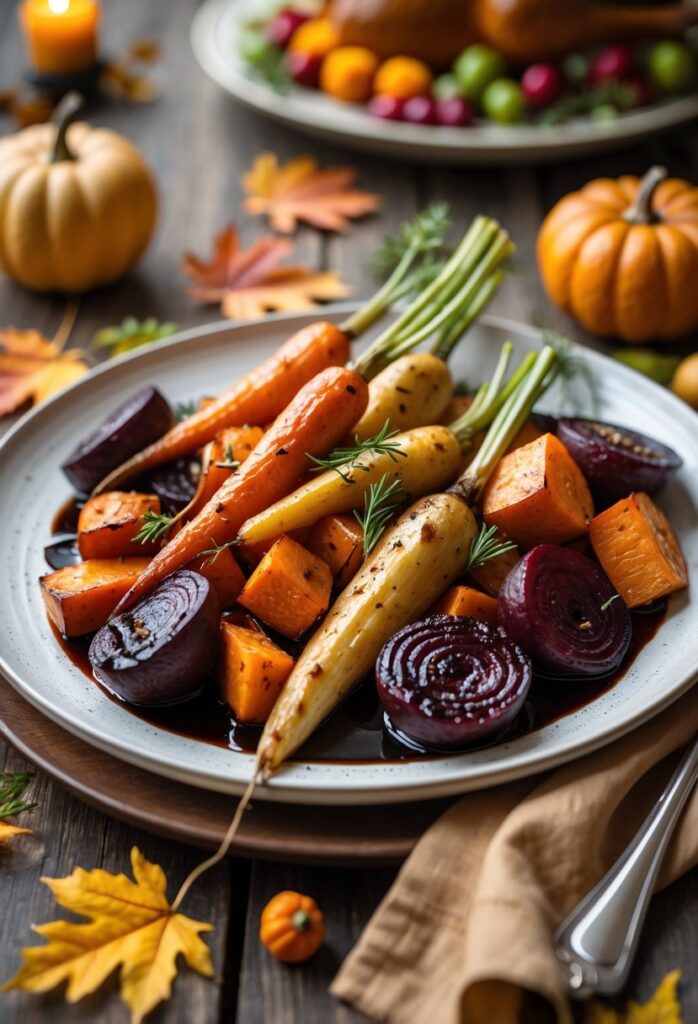 Roasted root vegetables with balsamic glaze make a flavorful and simple side dish for Thanksgiving. The combination of carrots, potatoes, parsnips, and beets offers a variety of textures and natural sweetness.