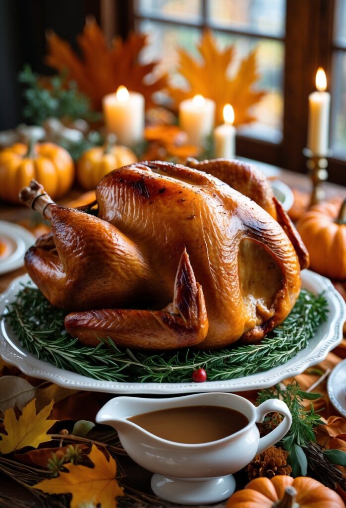 Garlic and herb butter is usually spread under the skin and on the surface, ensuring even seasoning and a golden-brown, crispy skin. The turkey is roasted slowly, which helps retain its juiciness.