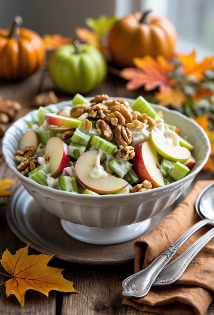 The Celery and Apple Waldorf Salad is a traditional dish often served at Thanksgiving. It combines crisp apples, crunchy celery, and walnuts in a creamy dressing.