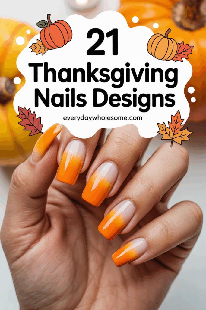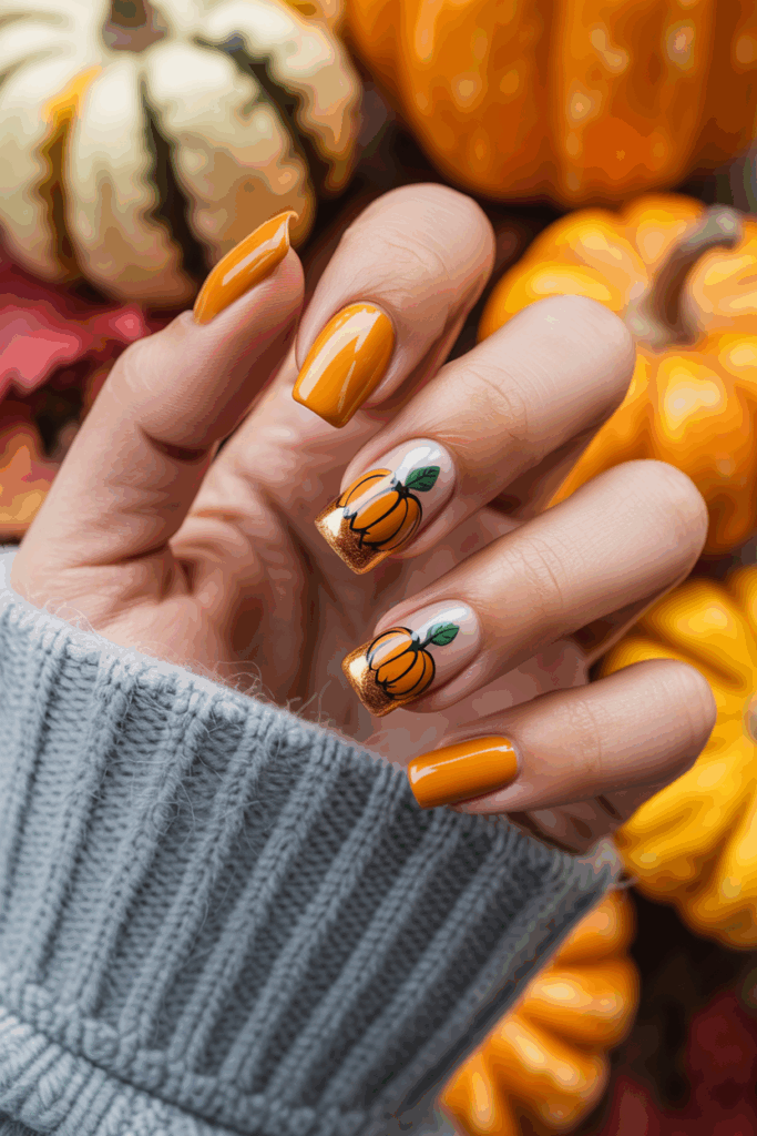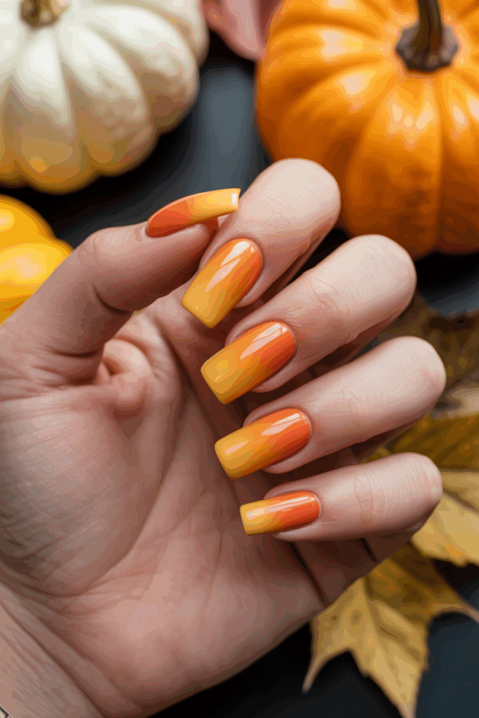 This design blends bright pumpkin orange with softer shades in a smooth gradient. It captures the colors of fall simply and elegantly. The look fits well for Thanksgiving and the entire autumn season.