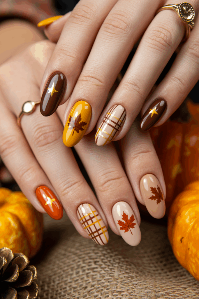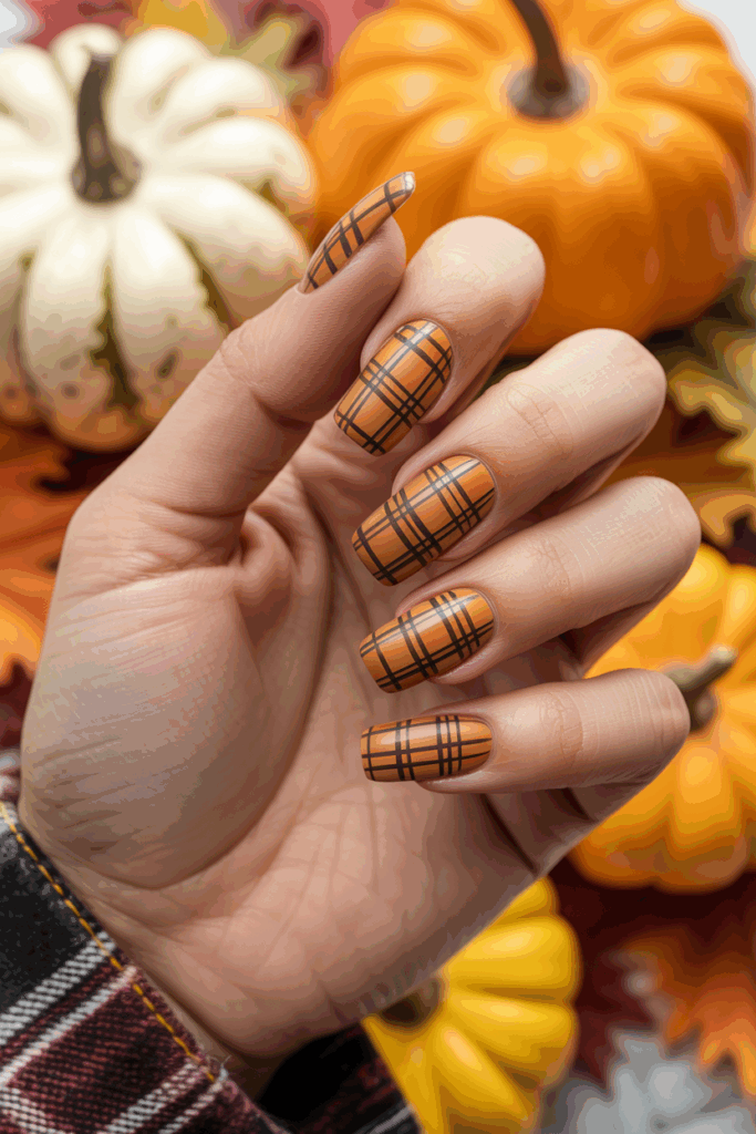 This design mixes classic plaid with small pumpkin accents. It uses earthy colors like green and beige for a cozy fall look.