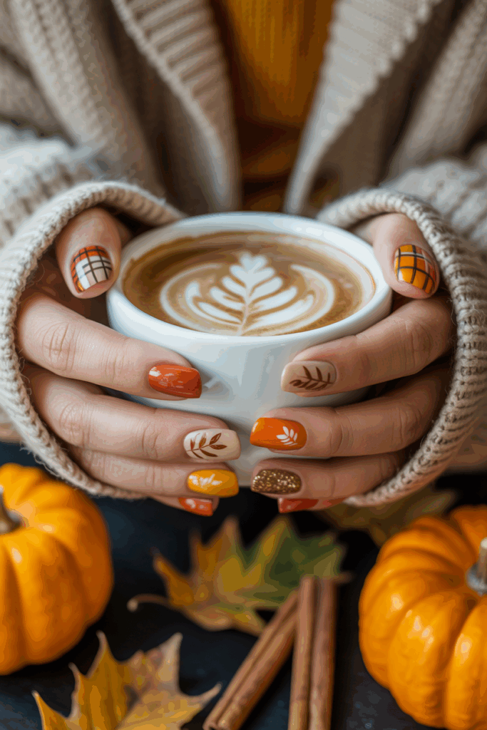 Pumpkin spice latte nails capture the warm colors of fall. They often use shades like burnt orange, cream, and brown.