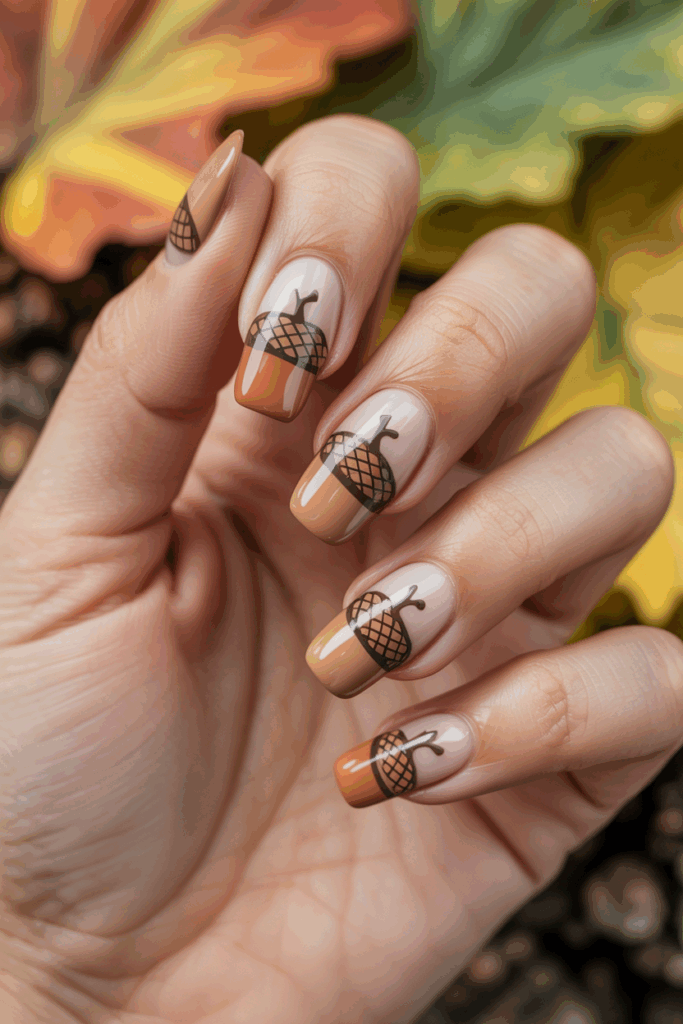 Clear or light-colored nails with acorns make the pattern stand out clearly.