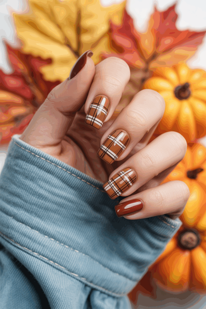 Autumn plaid nail art captures the cozy feeling of fall. It often uses warm colors like burgundy, gold, and cream. The patterns are simple, with lines crossing to create a classic plaid look.