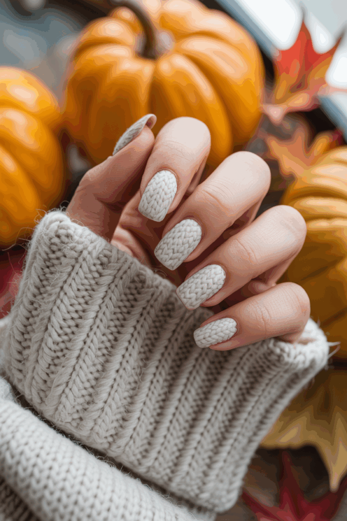 Cozy sweater texture nails mimic the look of knitted fabric. They use soft, warm colors like beige, brown, and deep reds. The textured effect adds depth and fits well with fall and Thanksgiving themes. This design is simple but elegant for a seasonal touch.