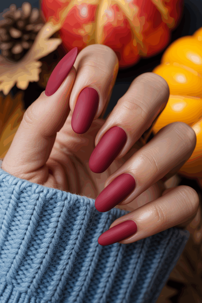 The cranberry red matte finish offers a rich, deep color perfect for fall. It gives nails a smooth, velvety look without shine. This style works well with simple designs or as a bold, stand-alone choice. It pairs nicely with warm autumn outfits and holiday settings.