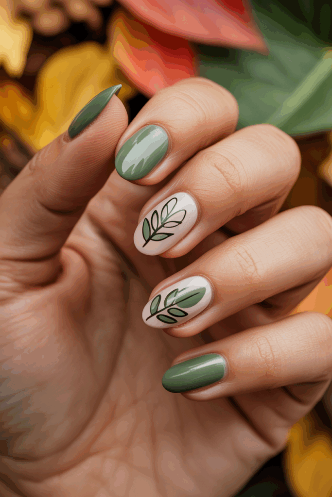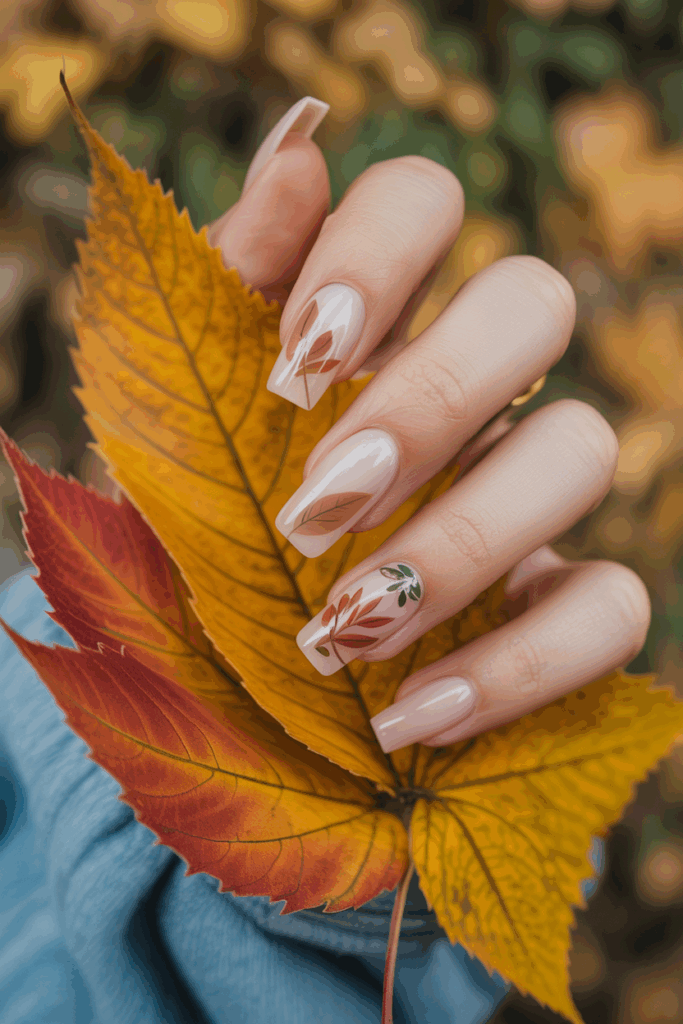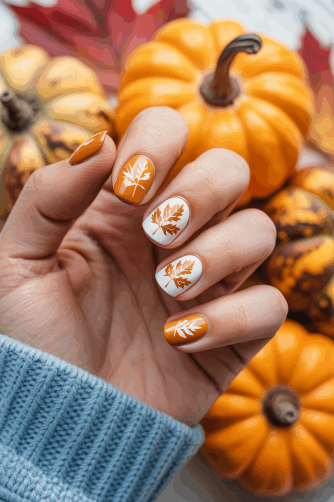 This design features small leaves in warm fall colors like orange, red, and yellow. It often uses simple shapes that look like oak or maple leaves. The pattern can be placed on all nails or just one as an accent. It matches well with neutral or soft brown backgrounds.