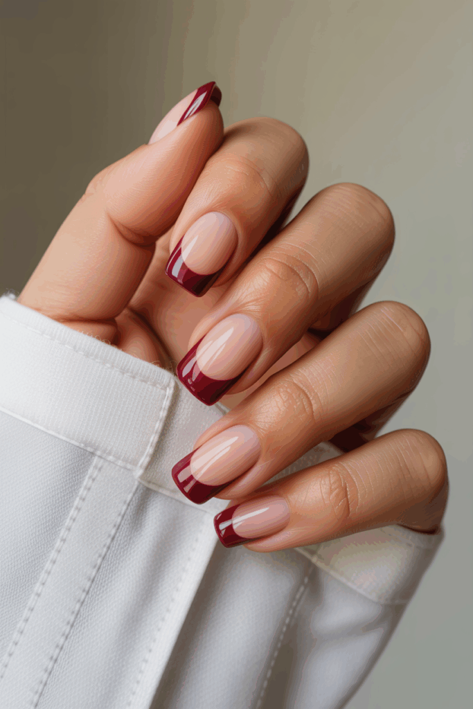This design features a clear or nude base with shiny burgundy tips. It gives a fresh twist on the classic French manicure.