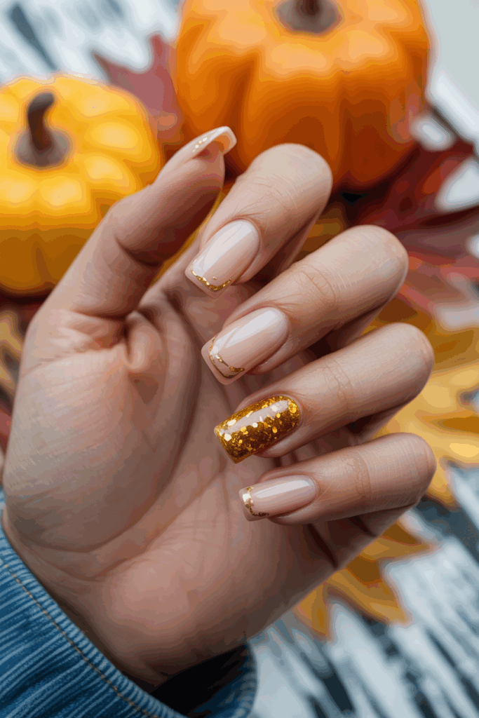 Golden glitter accent nails add a simple yet elegant touch to fall nail designs. They work well with soft, neutral bases or rich autumn colors. This style adds sparkle while keeping the look classy and perfect for Thanksgiving.