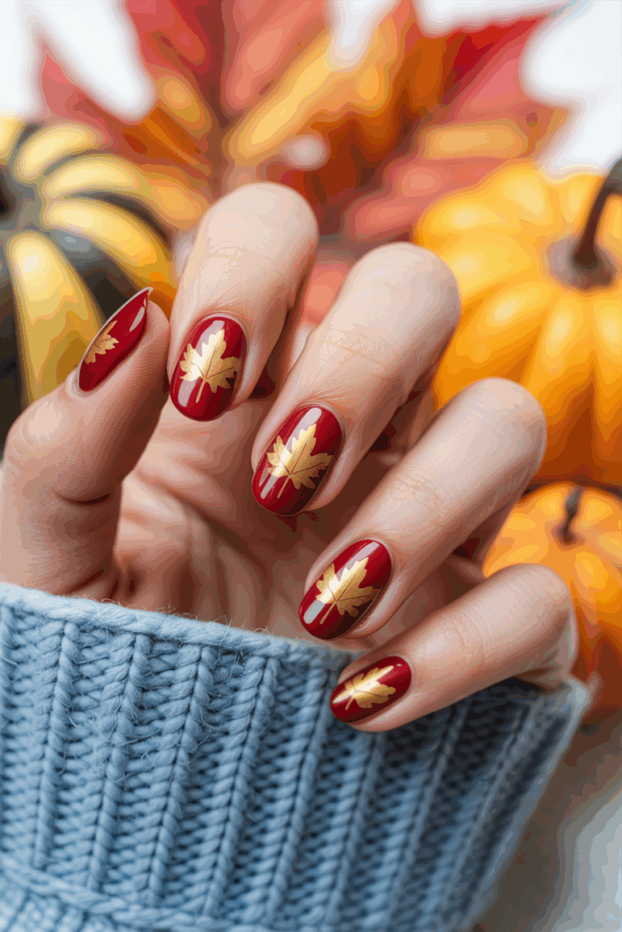 Maple leaf stamping is a popular choice for fall nail designs. It uses special stamping plates with leaf patterns to create clean, detailed images. This method gives a professional look with less effort. Many colors like red, gold, and brown suit the autumn theme well.