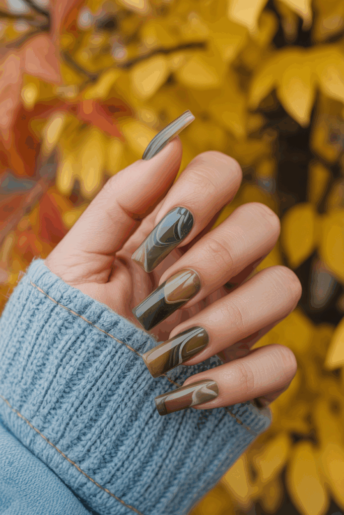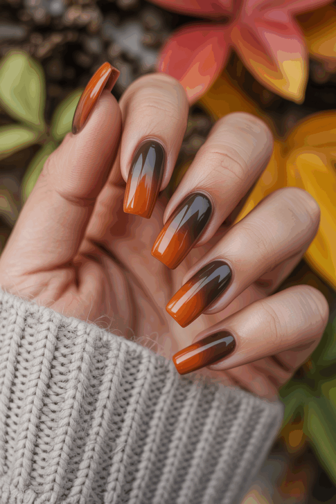 It offers a modern twist on traditional fall nails. The look works well with gel polish for smooth blending.