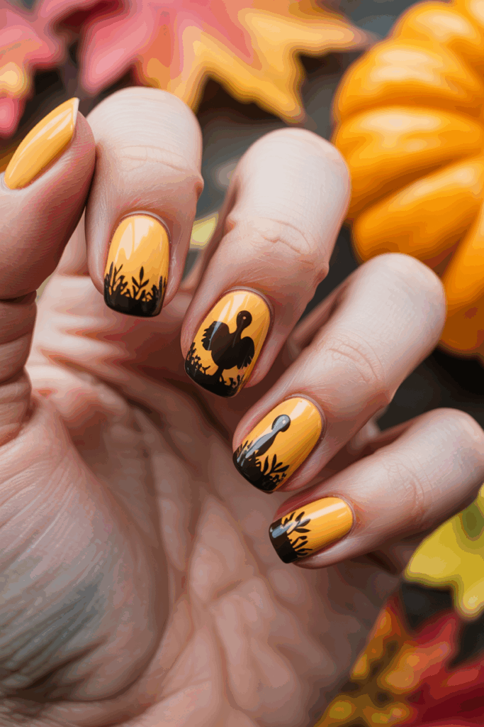 The Turkey Silhouette Manicure features simple outlines of turkeys on each nail. It uses dark colors like brown or black over warm fall shades.