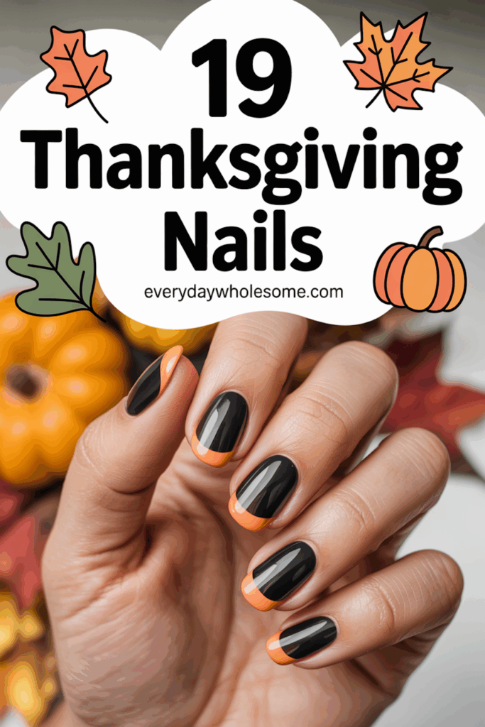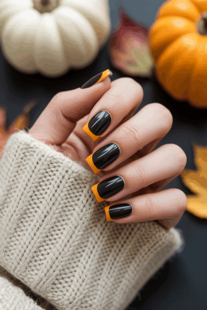 This design pairs a simple black base with bright orange tips. It works well on short nails by adding a clean, modern touch. The contrast between black and orange fits the Thanksgiving theme without being too bold.