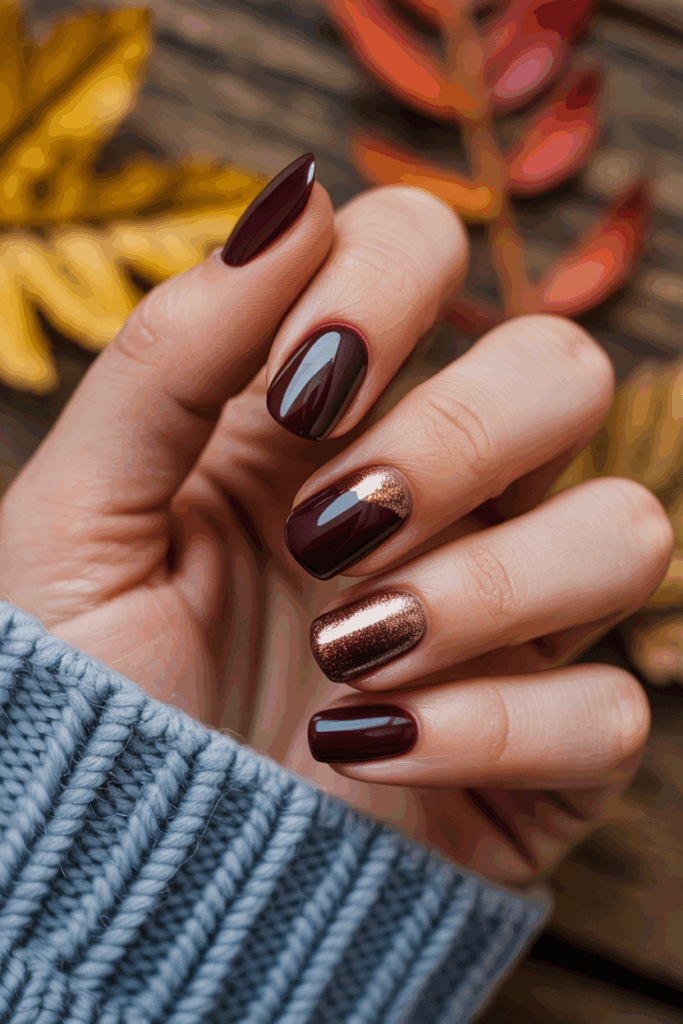 Dark burgundy is a strong, rich color perfect for fall. It works well on short nails, giving them a polished look.