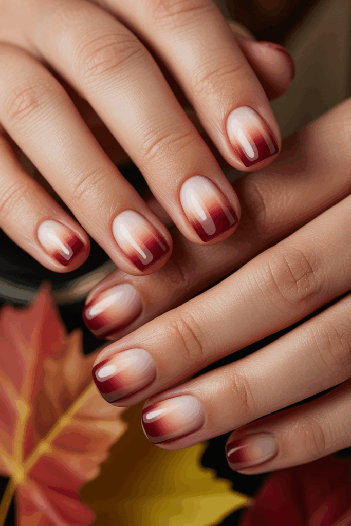 This style blends soft peach tones into deep crimson shades. It creates a smooth color change that looks natural on short nails.