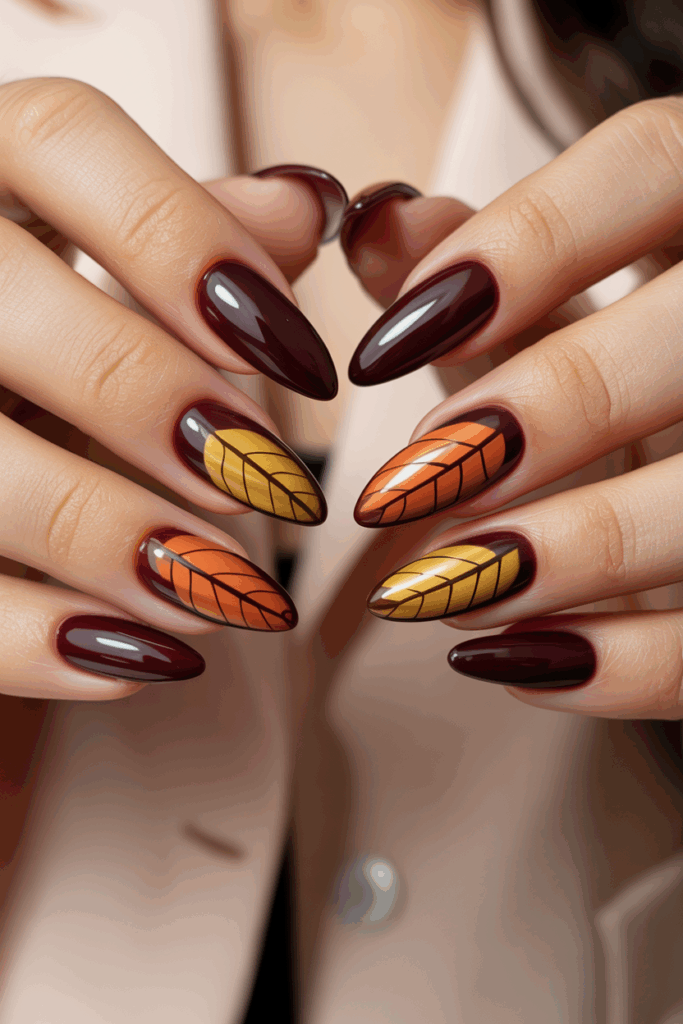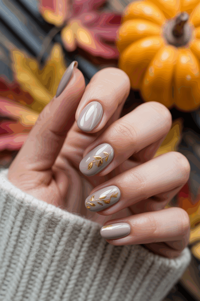 It works well for short nails and gives a balanced, sophisticated fall style.