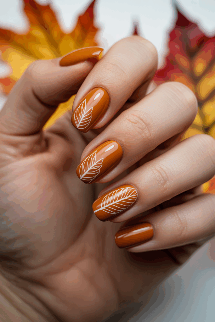 This style uses a burnt orange base that fits well with fall. The minimalist leaf lines add a simple but elegant detail.